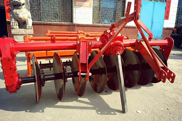 驅(qū)動圓盤犁采用拖拉機后三點懸掛機構(gòu)進行掛接,機具在工作過程中通過拖拉機后動力輸出軸(PTO)將動力傳遞到圓盤犁齒輪箱中,來驅(qū)動圓盤犁進行旋轉(zhuǎn)。該驅(qū)動圓盤犁主要適用于水田耕作,具有不纏草,作業(yè)質(zhì)量高,工作效率高的特點。